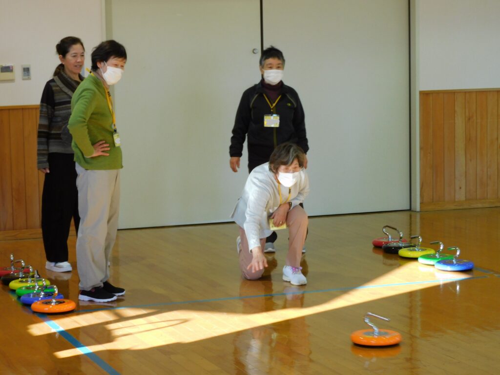 46期生スポーツレクリエーション科目では、カード等を使いゲーム感覚で楽しみながら頭を使う脳トレを中心とした創作ゲームや、ジェットローラーをポイントゾーンの中心に向けて投げ合い得点を競うカローリングを体験しました。