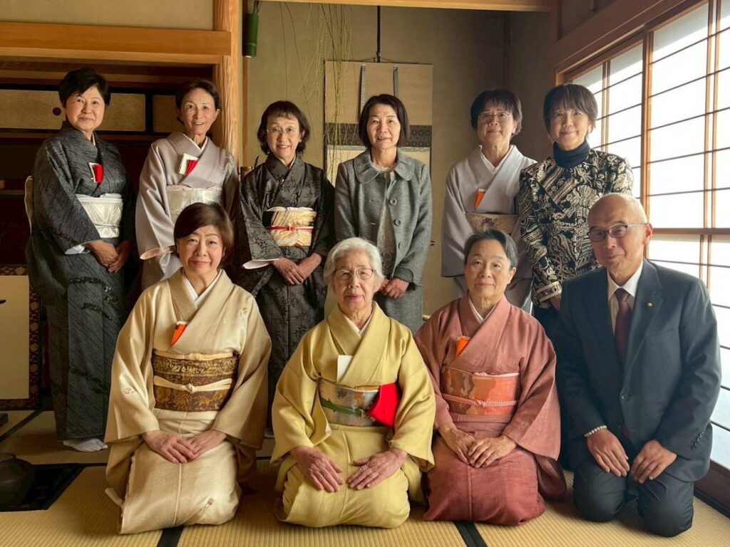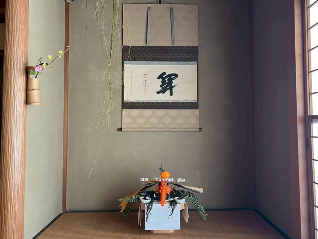 初釜とは、年明け門人が新年の挨拶をもって稽古を始動させる節目であります。この日伺った先生宅では、床の間に新年ならではの蓬莱飾りが施されていました。広間では日頃のお稽古で経験できない初炭点前(炭を使って火をおこすお点前)、貴重な茶杓、棗(なつめ)、茶碗、釜などのお道具を用いる薄茶点前が勉強になりました。さらに小間(四畳半)では、和蝋燭の侘助(わびすけ)の空間で、貴重なお茶碗を使って薄茶をいただきました。お菓子は、初釜ならではの「花びら餅」、「干菓子(京都産)」を美味しくいただきました。この日、同席した皆が受けたであろう感動は、さらに茶道の奥義を求め一層稽古に励むための刺激になったと思われます。