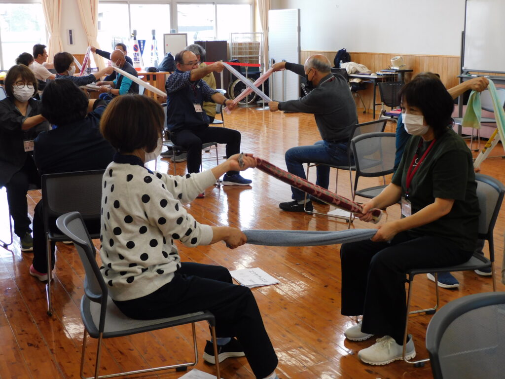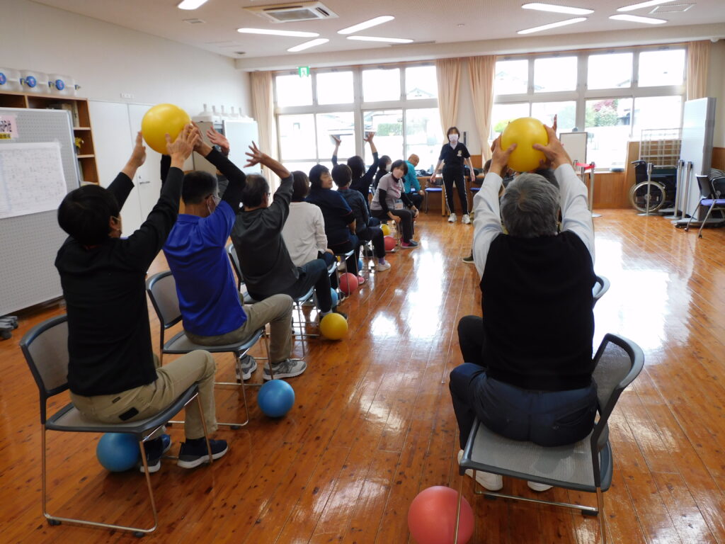 45期生健康づくり学科では、健康や体力の維持または増進を目的にタオルやボールを使い、背筋ストレッチや肩関節の柔軟性強化、上肢の可動域改善等を目的に簡単にできる「エクササイズ」を体験しました。