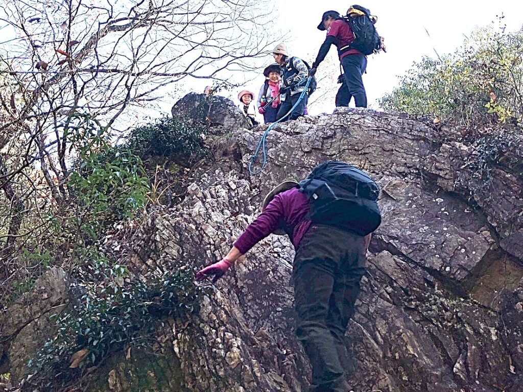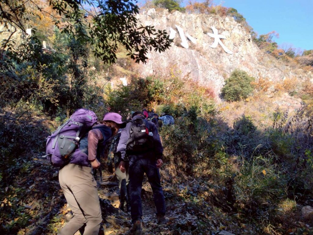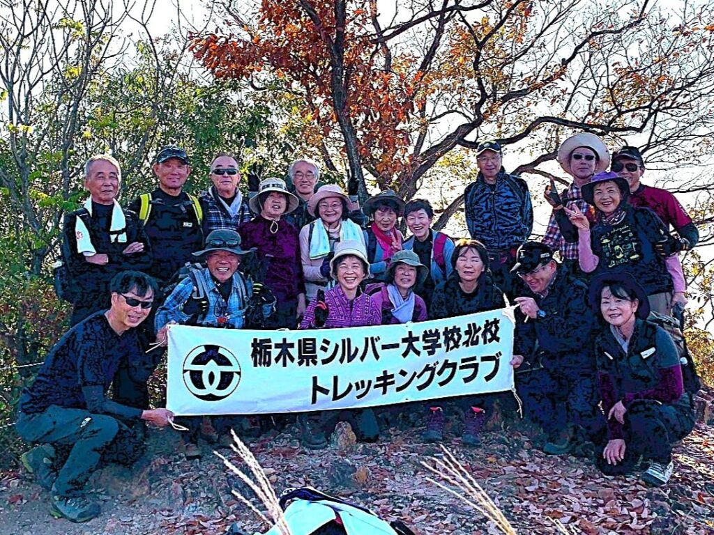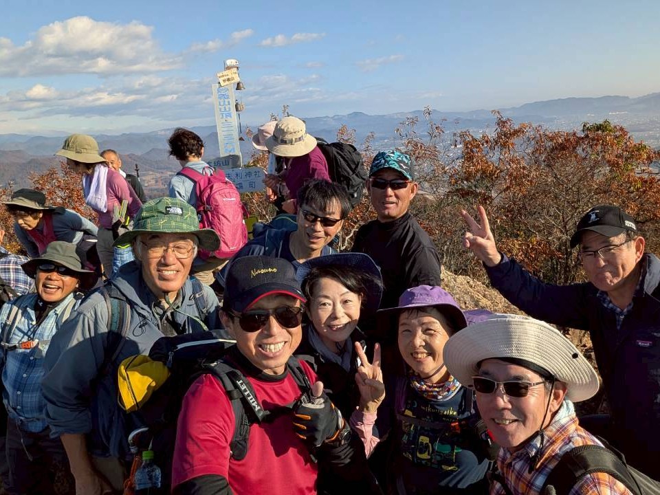 11月の定例山行は紅葉の中、足利の大小山から大坊山への縦走を行いました。46期生は初の定例山行への参加で、いきなりの急登に息も絶え絶えでしたが山頂からの絶景(富士山、浅間山、男体山等々)に疲れが吹き飛んだようでした。いくつもの小ピークを越えての大坊山への縦走路はロープや鎖を使う場面もあり、皆良い経験になりました。途中のピークでは恒例の「三百六十五歩のマーチ」の大合唱で元気を取り戻し、最終地点の大坊山では偶然にも山伏に出会い、そのホラ貝の音色に感動しました。
