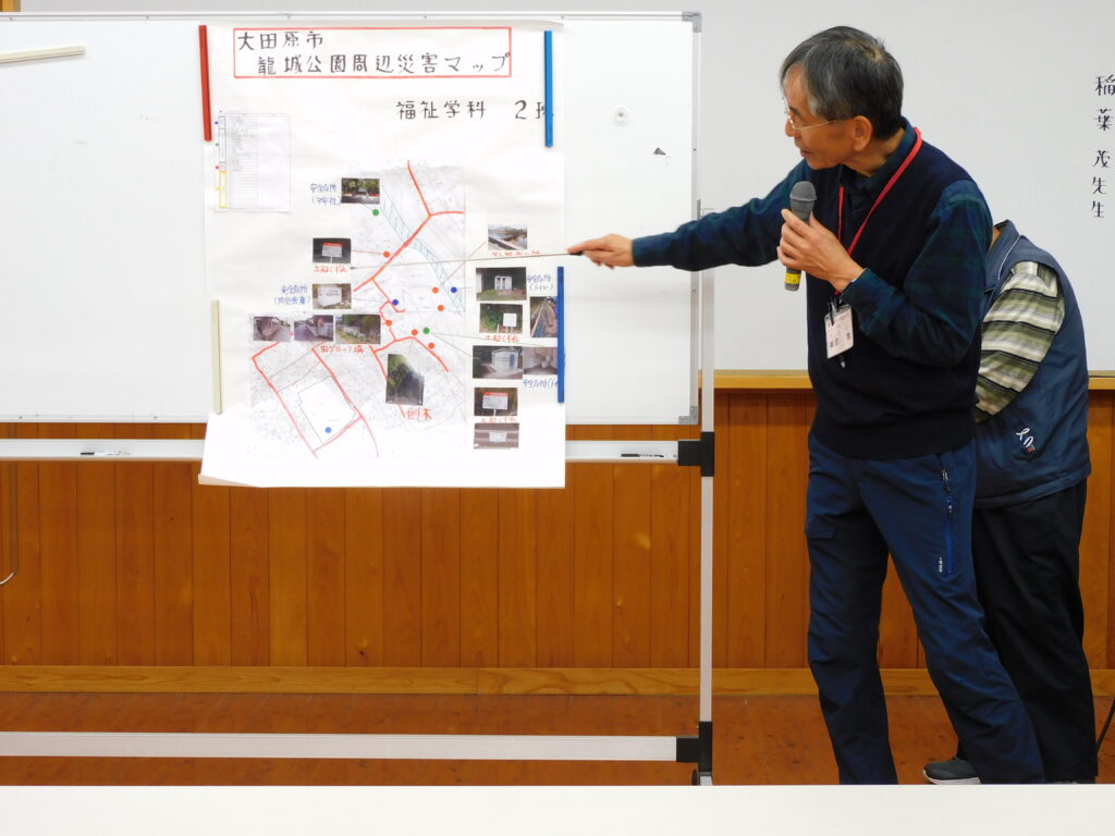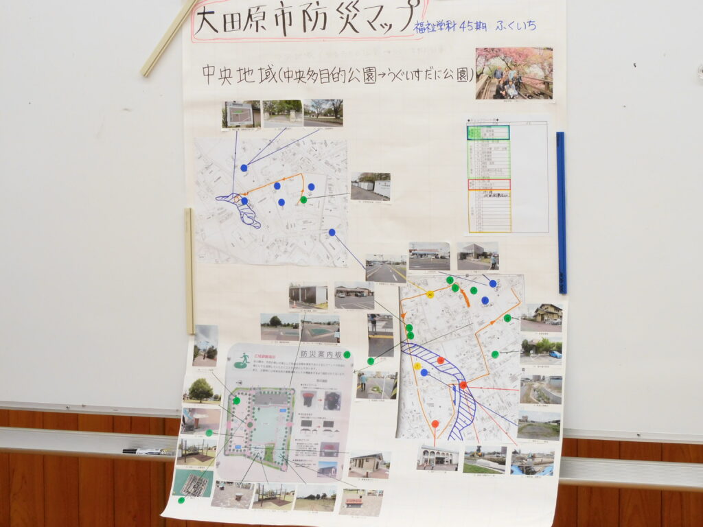 45期生福祉学科では、地図を基に災害時に役に立つ場所や危険な場所などを点検しながらまち歩き(大田原市内)をし、地域の実情にあったオリジナル防災マップを作成しグループごとに発表をしました。