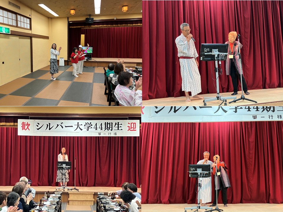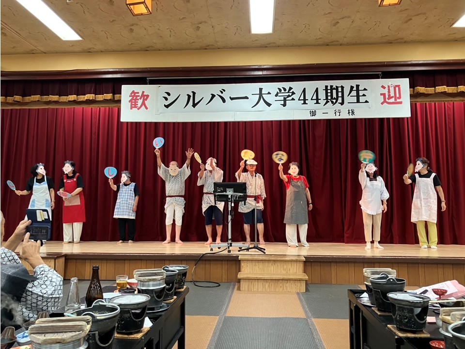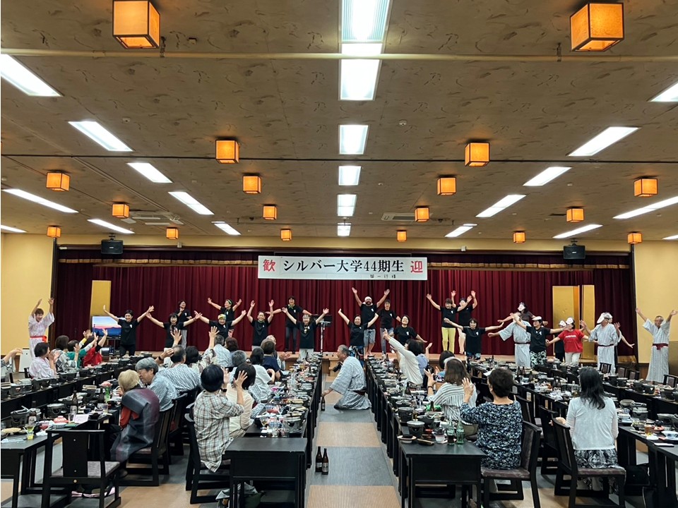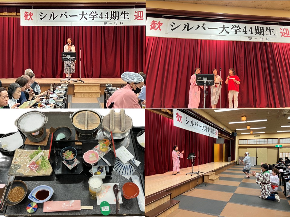 44期卒業旅行のお宿は、山梨県石和温泉の「慶山」さんにお世話になりました。集合写真撮影後、大広間にて自治会長の挨拶で開宴となりました。余興では、演芸会を彷彿とさせるようような多才な出し物が繰り広げられました。カラオケ、マジック、サザエさん創作ダンスなどが披露されました。また、歌おう会では学校祭で披露した「恋する夏の日」が再現され、結びにアフリカンダンスクラブによるダンスが披露されました。2年間ともに学んだ学友の絆は固く、心を開いて楽しい時間を過ごすことができました。シルバー大学校に感謝!