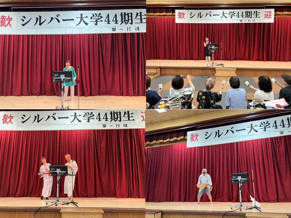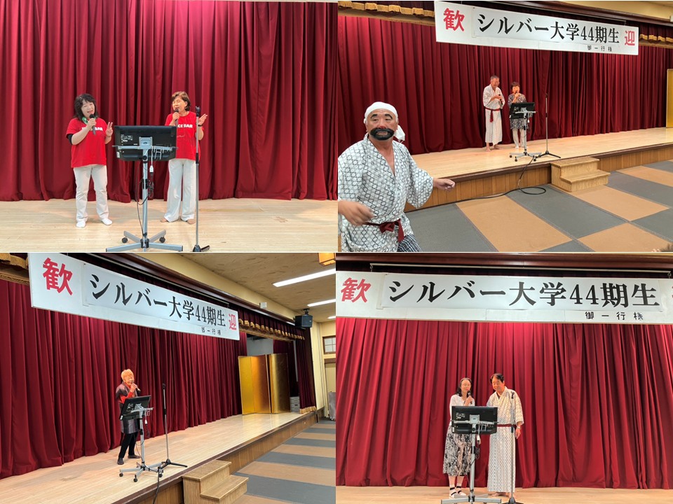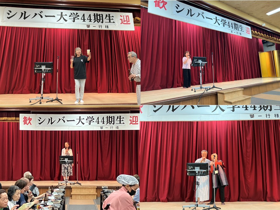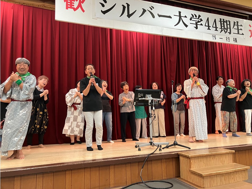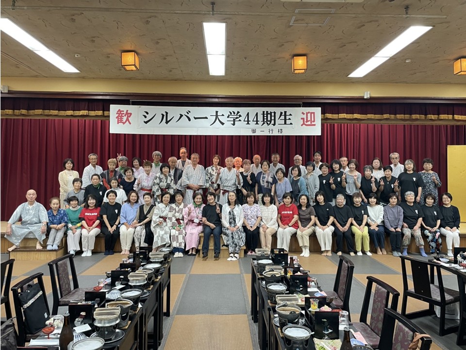 44期卒業旅行のお宿は、山梨県石和温泉の「慶山」さんにお世話になりました。集合写真撮影後、大広間にて自治会長の挨拶で開宴となりました。余興では、演芸会を彷彿とさせるようような多才な出し物が繰り広げられました。カラオケ、マジック、サザエさん創作ダンスなどが披露されました。また、歌おう会では学校祭で披露した「恋する夏の日」が再現され、結びにアフリカンダンスクラブによるダンスが披露されました。2年間ともに学んだ学友の絆は固く、心を開いて楽しい時間を過ごすことができました。シルバー大学校に感謝!